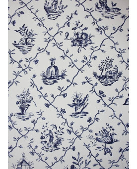 79,50 €Papier peint Toile de Jouy, collection Charles Burger, Robinson Crusoe, dessin bleu sur fond blanc, référence 2234-001.